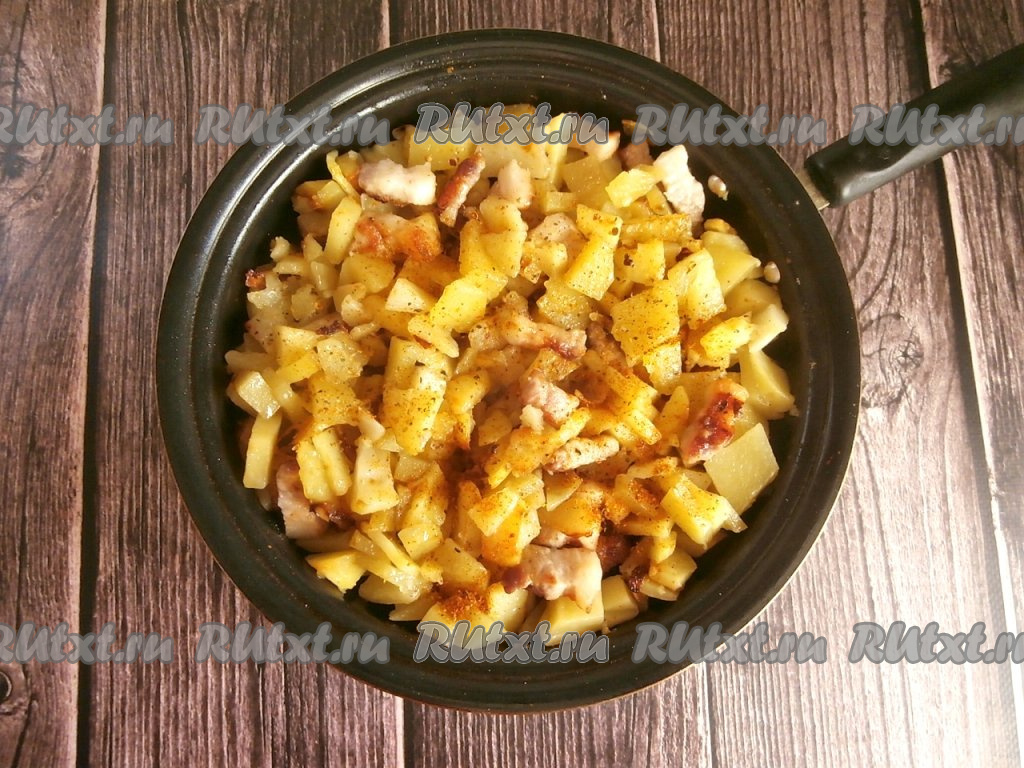 Перемешать картошку со свиной грудинкой, накрыть сковороду крышкой, убавить немного огонь и готовить блюдо 25 минут (готовая картошка должна легко прокалываться вилкой), периодически перемешивая. В конце приготовления всыпать соль, специи, перемешать.