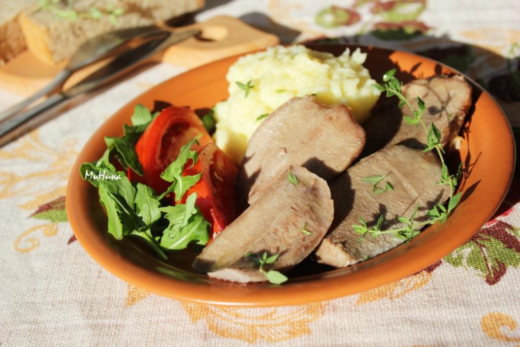 Свиной язык очень подходит для диетического питания, содержит много биологически активных веществ, лецитин, витамины группы В, фосфор и, главное, обладает отличными вкусовыми качествами. Предлагаю вариант приготовления ароматного свиного языка с тимьяном и другими приправами. На гарнир очень вкусно картофельное пюре, так же с ароматной подливой, и салаты из свежих овощей.