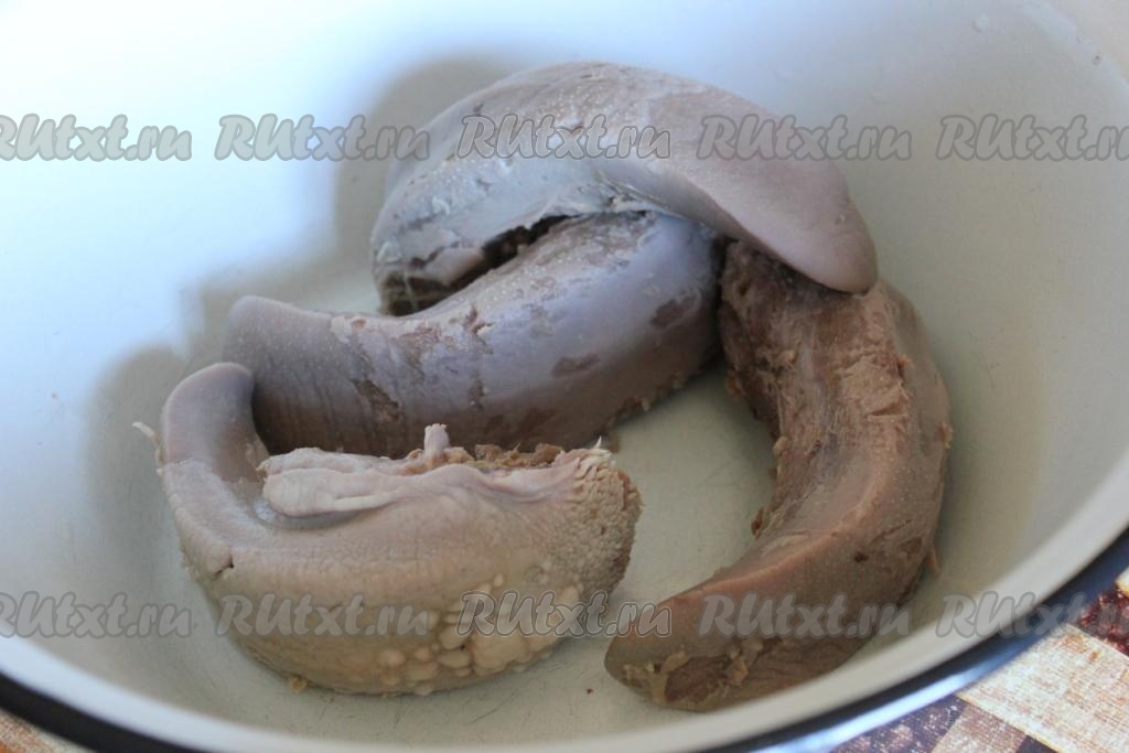 Затем на несколько секунд пометите готовые горячие свиные языки в холодную воду и очистите их от пленок.