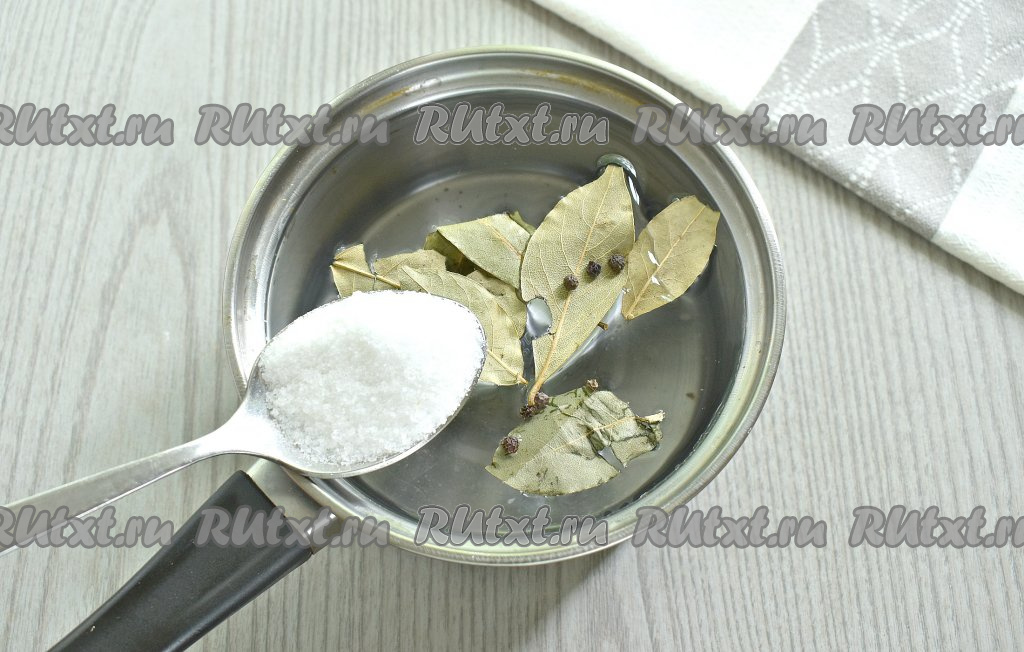 В тёплую воду всыпаем соль, добавляем перец чёрный горошком и лавровые листы, перемешиваем. Оставляем так рассол остывать. Периодически перемешиваем его, чтобы соль полностью растворилась.