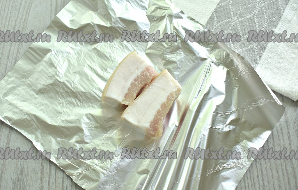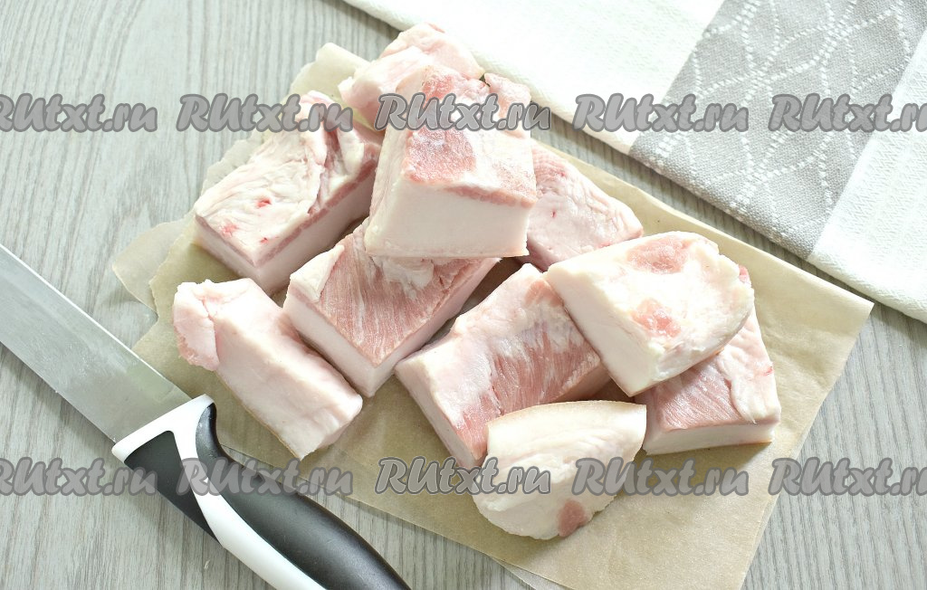 Шкурку у сала скоблим ножом. Ополаскиваем сало в холодной воде и обтираем бумажными салфетками. Сало нарезаем на крупные куски, которые свободно будут проходить в банку.