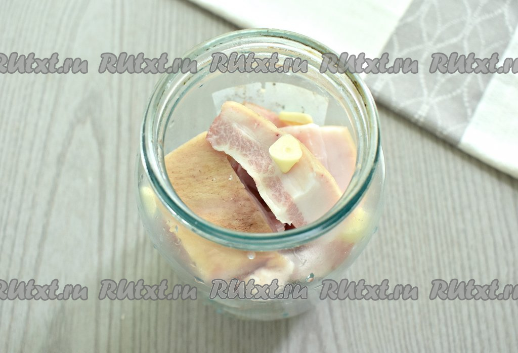 Банку заполняем салом, чередуя его с нарезанным чесноком.