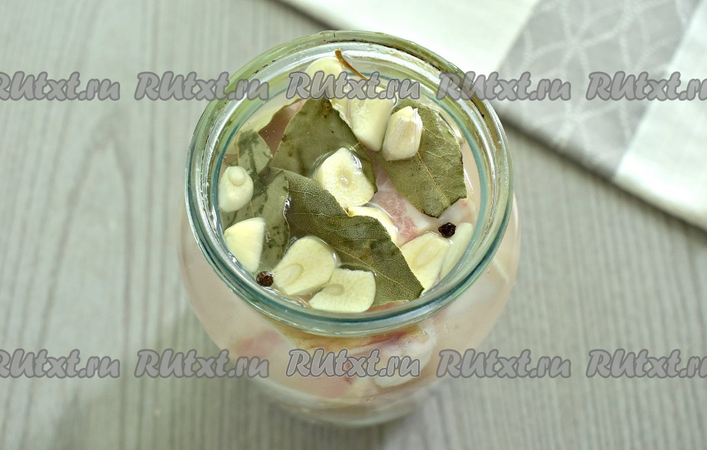 Из рассола перекладываем в банку сначала лавровые листы и горошины перца. Теперь сало заливаем холодным рассолом (я солила только 500 грамм сала, поэтому рассол у меня ещё остался).