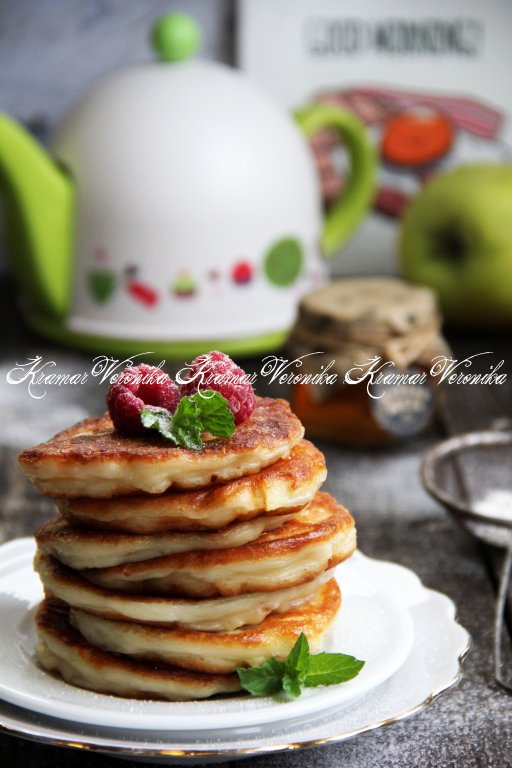 Нежные, вкусные, ароматные творожные оладьи, приготовленные с яблоками на кефире, к столу можно подать и горячими, и остывшими, дополнив мёдом или сметаной.
