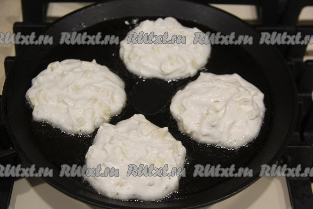 В сковороду влить растительное масло, хорошо его разогреть. Выкладывать на сковороду по 1 столовой ложке творожно-яблочного теста, формируя круглые оладьи.