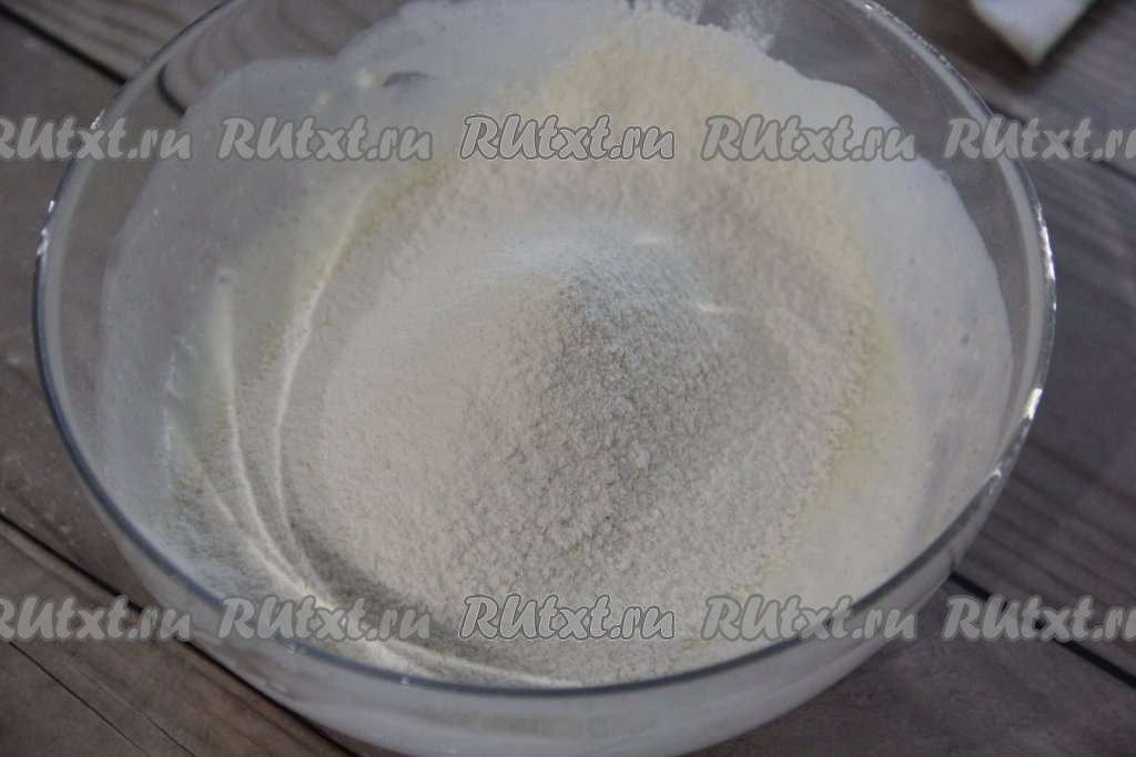 Добавить соль и сахар, частями всыпать просеянную муку, перемешивая тесто для оладий венчиком.