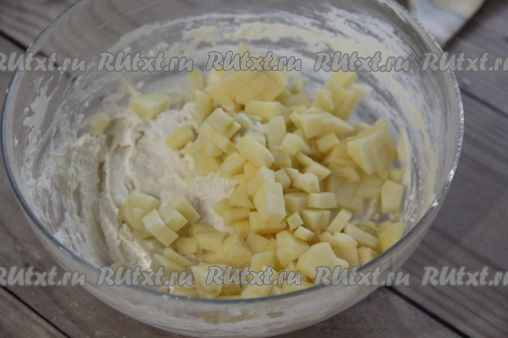 Нарезать на мелкие кубики яблоко, очищенное от кожуры и семечек. Добавить кубики яблока в творожное тесто.