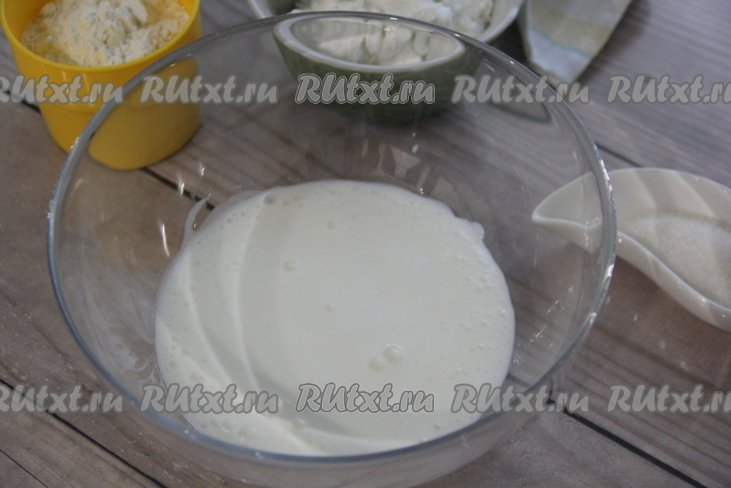 В объёмную миску влить кефир, затем добавить соду, перемешать и оставить минут на 5. За это время кефир вступит в реакцию с содой.