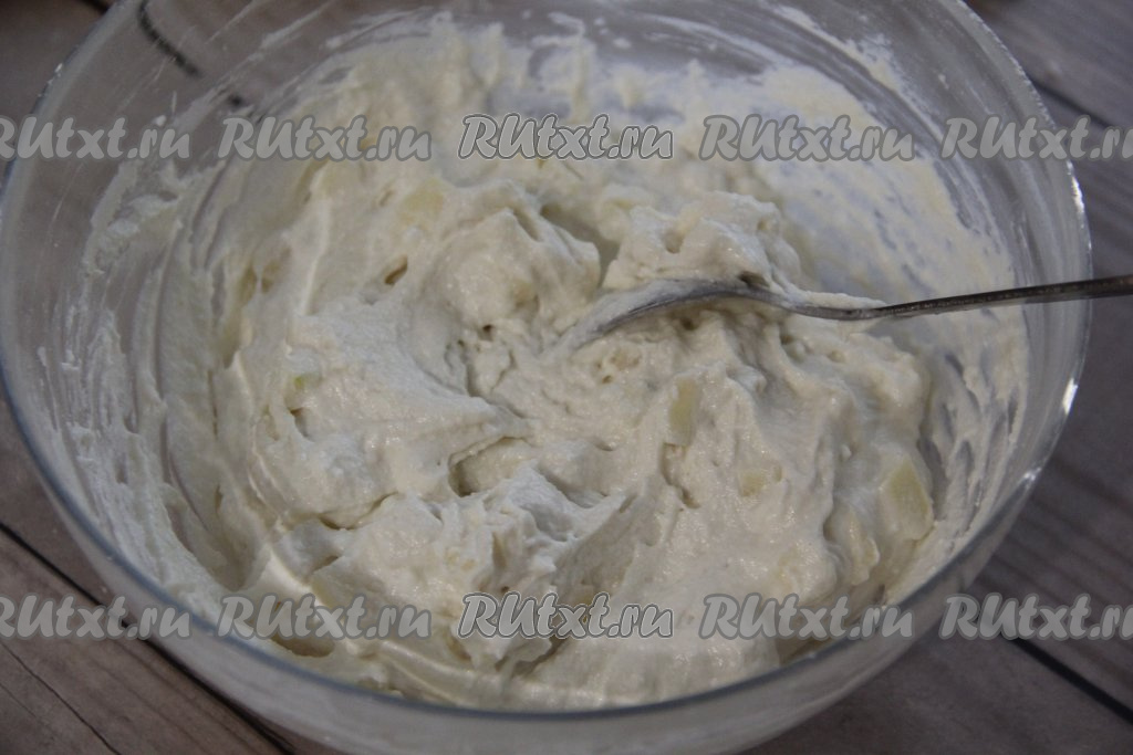 Затем добавить творог и перемешать венчиком.