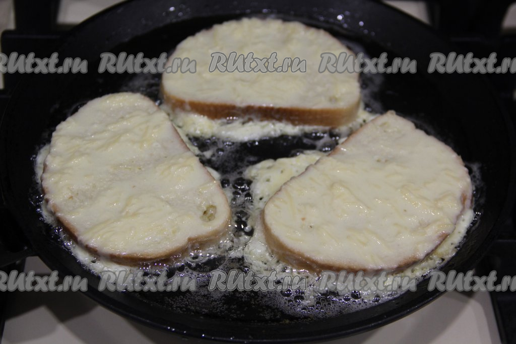 Выложить кусочки батона в сковороду.