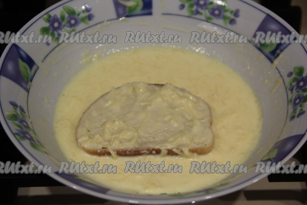 В сковороду влить масло и разогреть. Обмакнуть кусочки батона с двух сторон в сметанно-сырную смесь.