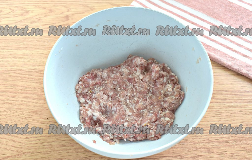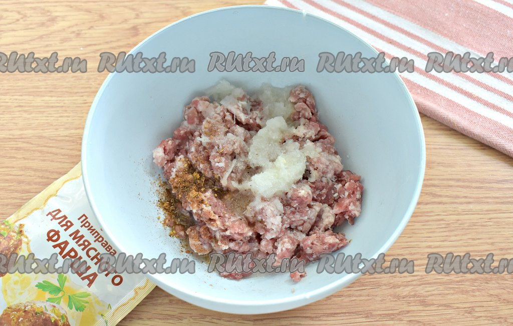 Мясо свинины и говядины перекручиваем на мясорубке. Фарш перекладываем в миску. Очищаем лук, измельчаем его с помощью тёрки (или мелко нарезаем ножом), перекладываем к фаршу. По вкусу солим фарш, всыпаем готовую приправу или подходящие специи (например, перец чёрный молотый, паприку). Вливаем к фаршу 1,5 столовые ложки холодной воды.