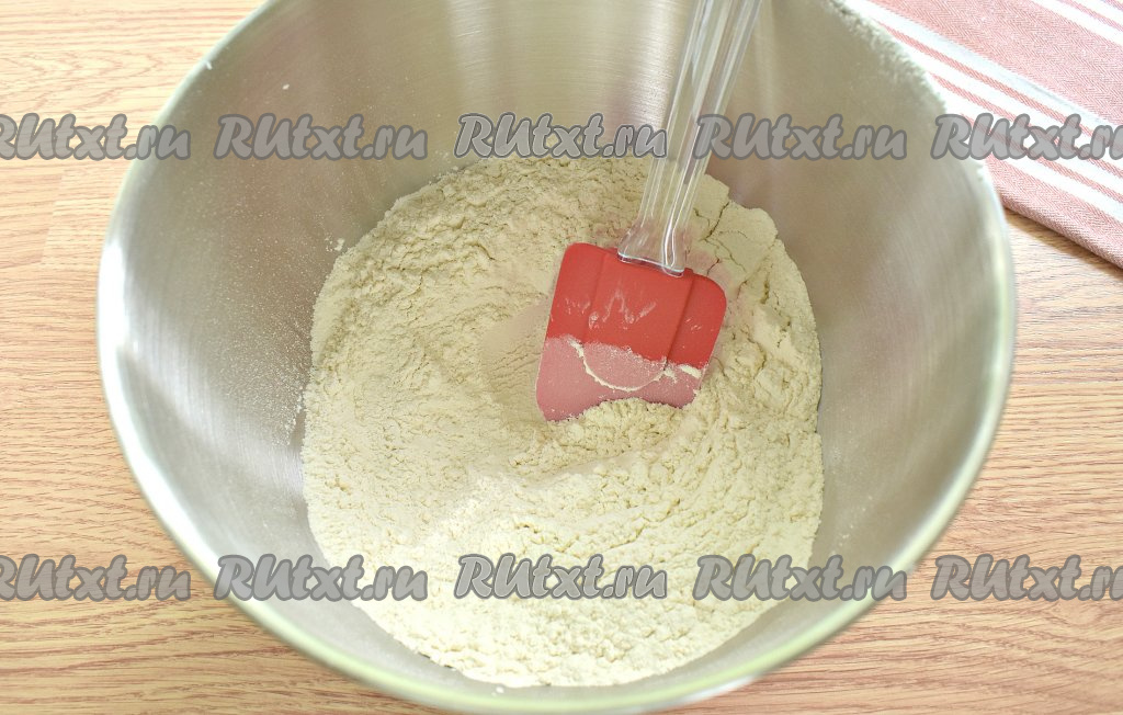 Вначале замесим тесто для пельменей, для этого в миску просеиваем муку, всыпаем соль и перемешиваем ингредиенты между собой лопаткой (или ложкой), образуя в центре муки углубление.