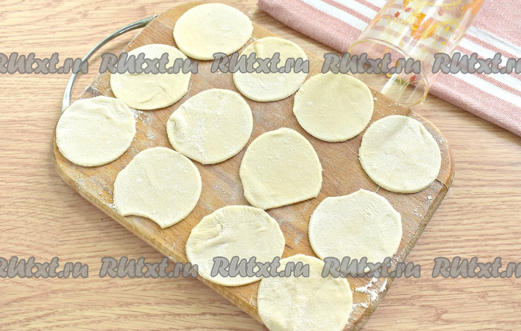 Тесто делим на 3 куска. Каждый кусок теста на присыпанной мукой поверхности раскатываем в тонкий пласт толщиной, примерно, 2 миллиметра. С помощью стакана вырезаем круглые заготовки для пельменей (я вырезала кружочки диаметром 6 сантиметров).