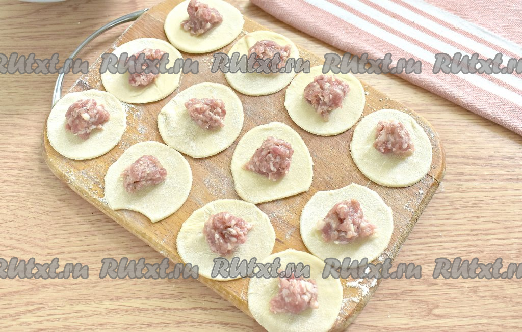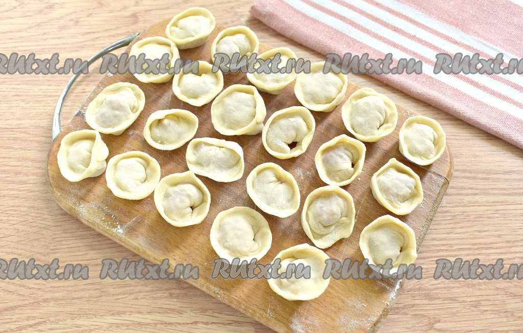 Крепко скрепляем края каждого кружочка, уголки соединяем, формируя пельмешки. Так лепим все пельмени. Примерно получается 80 пельменей.