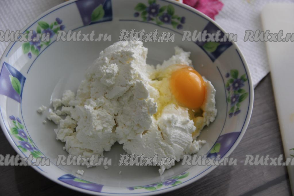 Перемешать творог с яйцом при помощи вилки. Затем к творожно-яичной смеси выложить сыр, натёртый на мелкой тёрке.