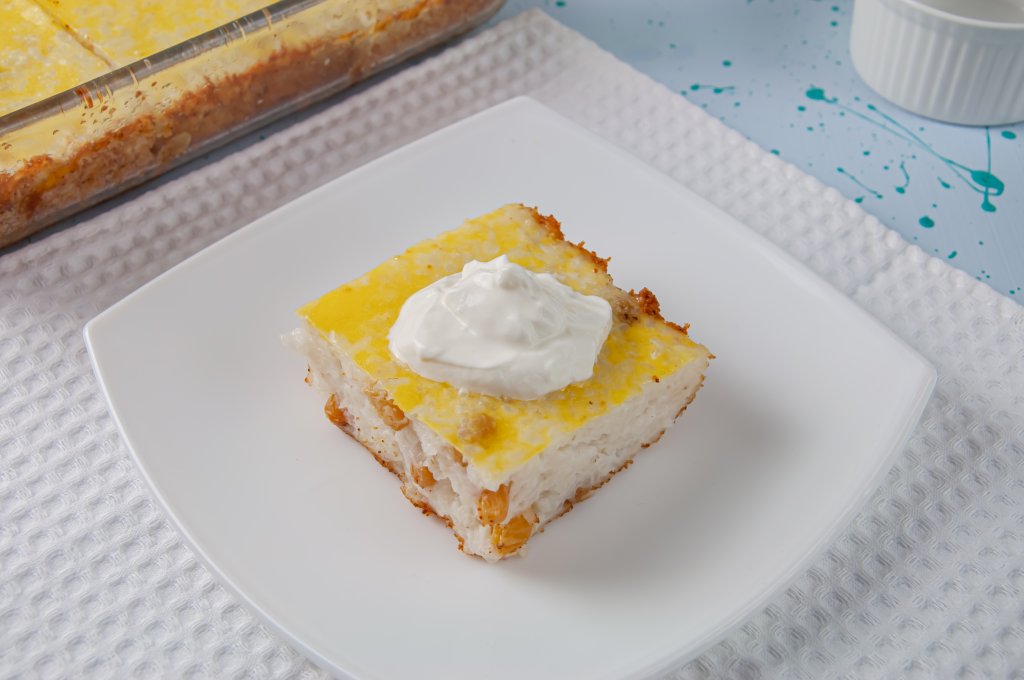 Смешайте в отдельной ёмкости сметану и желток, затем смажьте этой смесью поверхность будущей запеканки. Поместите форму в разогретую до 180 градусов духовку минут на 30-40 (до появления золотистой корочки).