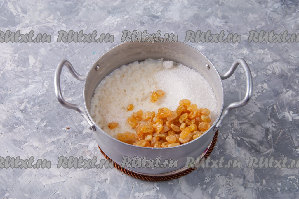 Яйцо разделите на желток и белок. Добавьте к остывшей рисовой каше соль, сахар, яичный белок и изюм, тщательно перемешайте.