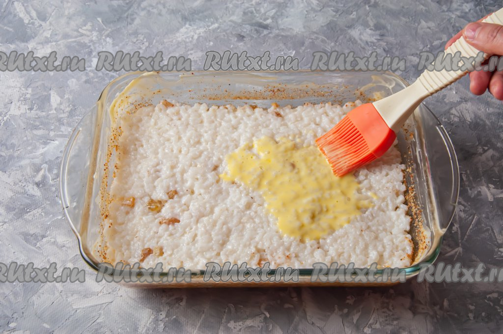 Выложите рис, смешанный с изюмом, в форму для запекания, разровняйте поверхность ложкой.