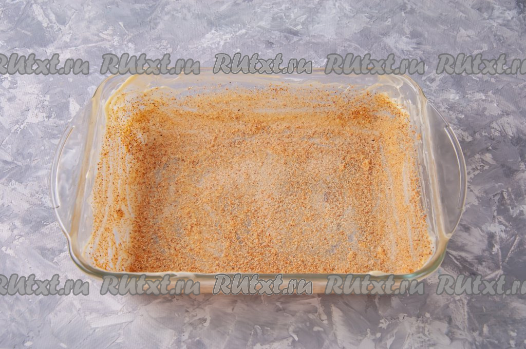Возьмите жаропрочную форму (у меня форма размером 17 сантиметров на 24 сантиметра). Для того чтобы запеканка не пристала к форме, смажьте форму обильно сливочным маслом, затем присыпьте панировочными сухарями.