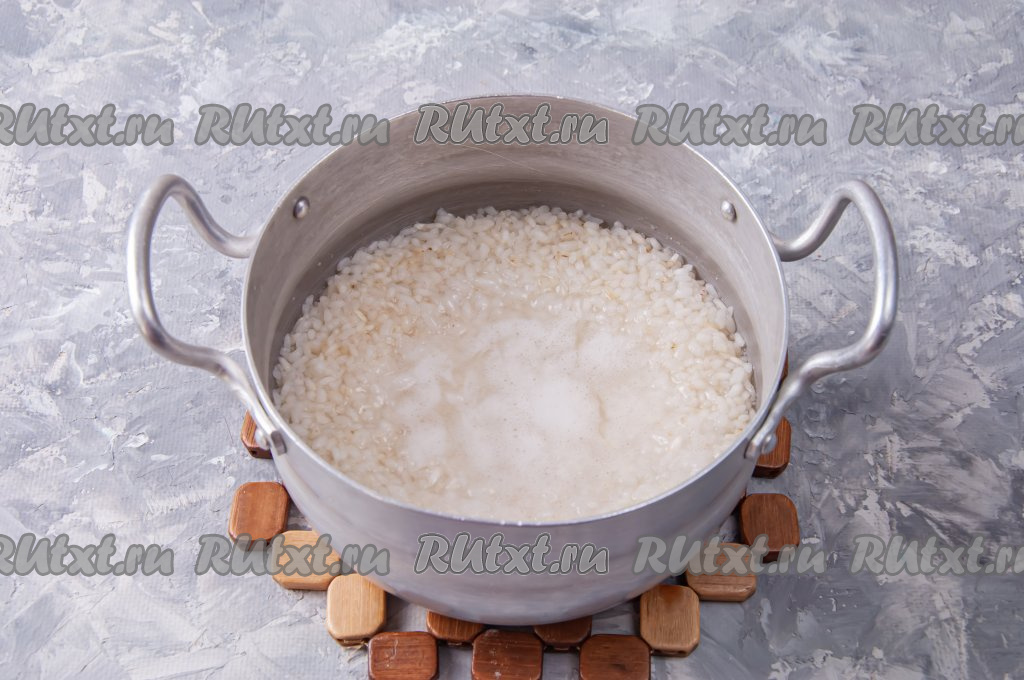 Как только вода закипит, положите в неё рис, перемешайте и с момента закипания варите на слабом огне 8-10 минут. В другую кастрюльку налейте молоко, поставьте на огонь, дайте закипеть.