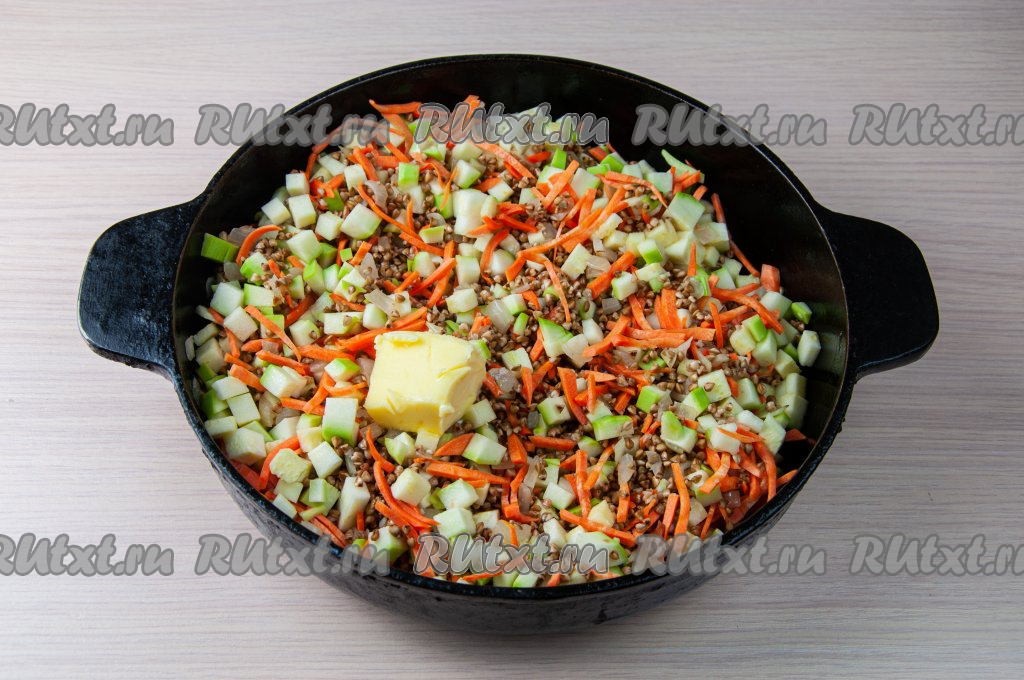 Затем к гречке с луком добавьте натёртую на крупной тёрке морковку, нарезанный на небольшие кубики кабачок и сливочное масло, посолите, поперчите по вкусу и перемешайте.