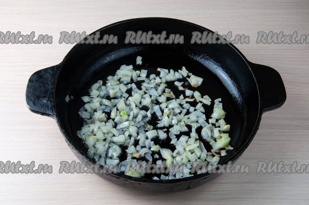 Очистите лук и морковь. Если у кабачка кожица жёсткая, тогда срежьте её, крупные семечки тоже лучше удалить. Налейте на горячую сковороду растительное масло, выложите лук, нарезанный на мелкие кубики, и обжарьте его на среднем огне в течение 3-4 минут (до прозрачности), помешивая.
