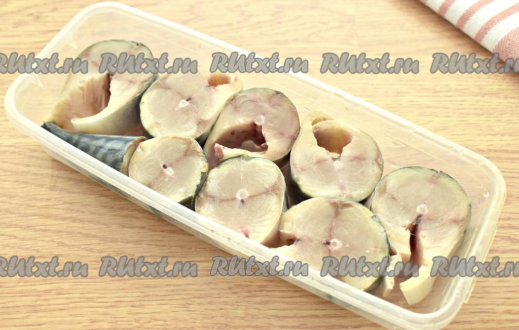 Солить скумбрию можно в пластиковом контейнере или в стеклянной банке. Кусочки скумбрии складываем в контейнер.