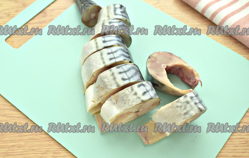 Нарезаем подготовленную скумбрию на кусочки шириной, примерно, 2,5 сантиметра.