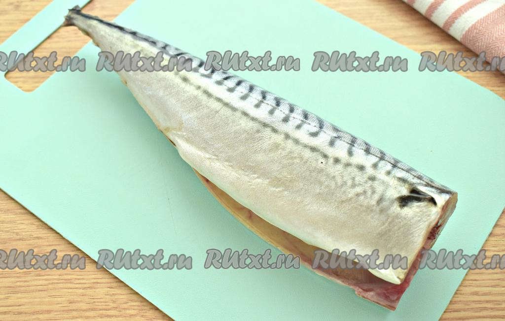 Отрезаем голову, хвост и плавники рыбы. Удаляем внутренности из брюшка скумбрии. Внутри брюшка имеется чёрная плёночка, её обязательно нужно удалить, иначе рыба будет горчить.