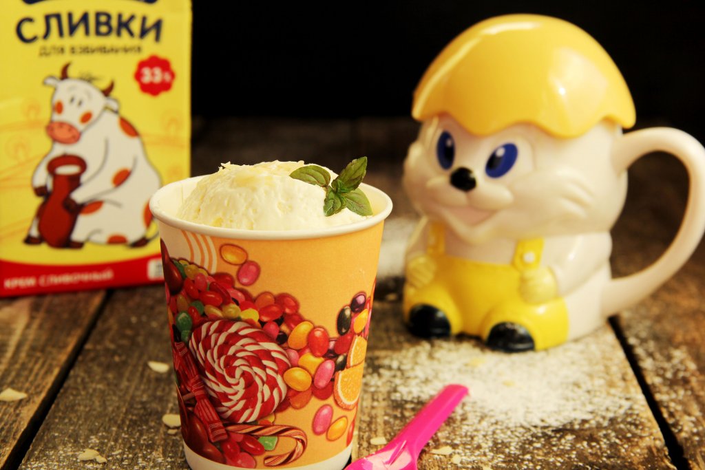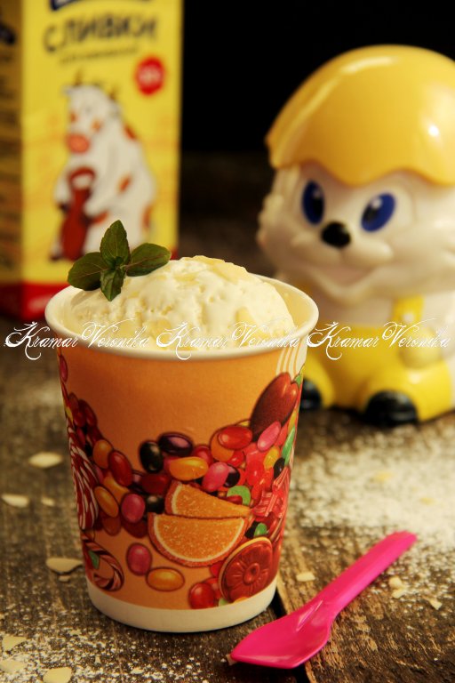 Вкусное, нежное мороженое "Пломбир", приготовленное из сгущёнки и сливок в домашних условиях, подать к столу в стаканчиках или креманках.