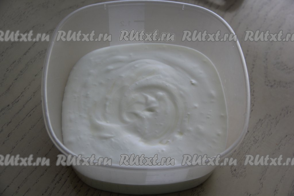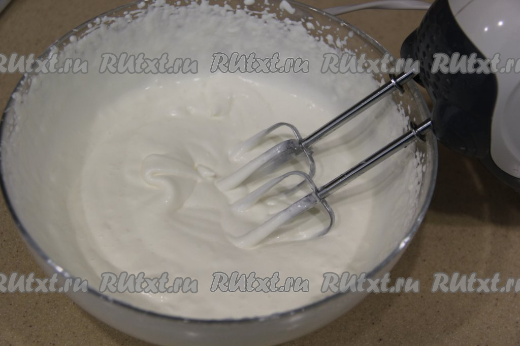 Влить хорошо охлаждённые сливки в миску, удобную для взбивания. Взбить сливки миксером до мягких пиков. Время взбивания зависит от качества сливок и мощности миксера.