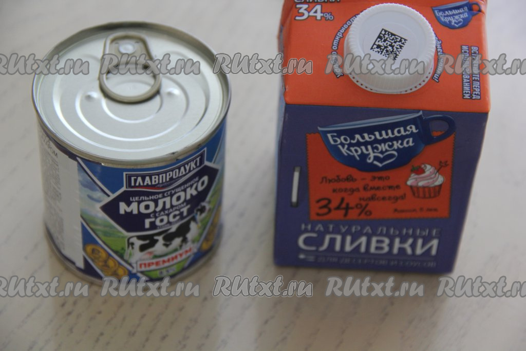 Влить сгущёнку во взбитые сливки и взбивать миксером 1-2 минуты.