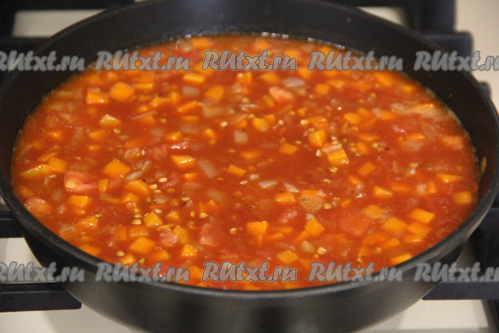 Отдельно соединить воду, томатную пасту, соль и любые специи, хорошо перемешать, влить в сковороду, перемешать.