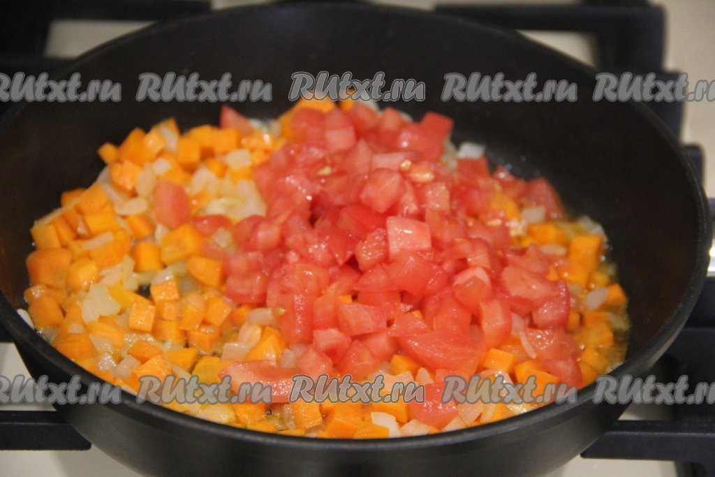 Помидор достать из воды, снять шкурку и нарезать его достаточно мелко. Добавить помидор в сковороду к овощам, перемешать и обжаривать, иногда помешивая, 3-5 минут.