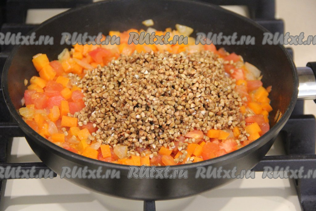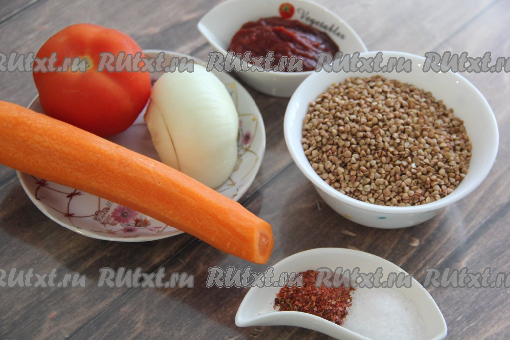 Подготовить продукты. Лук и морковь почистить. Помидор вымыть. Гречку перебрать и промыть, лишнюю воду слить.