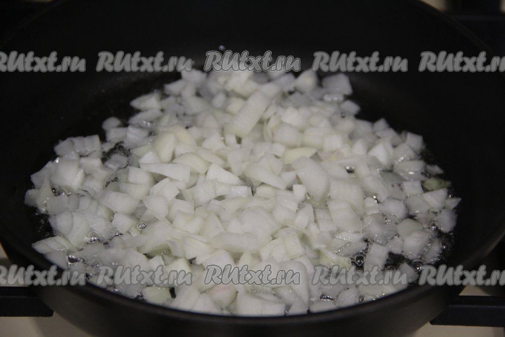 В сковороду влить растительное масло, выложить мелко нарезанную луковицу. Жарить лук около 5 минут на среднем огне, иногда помешивая.