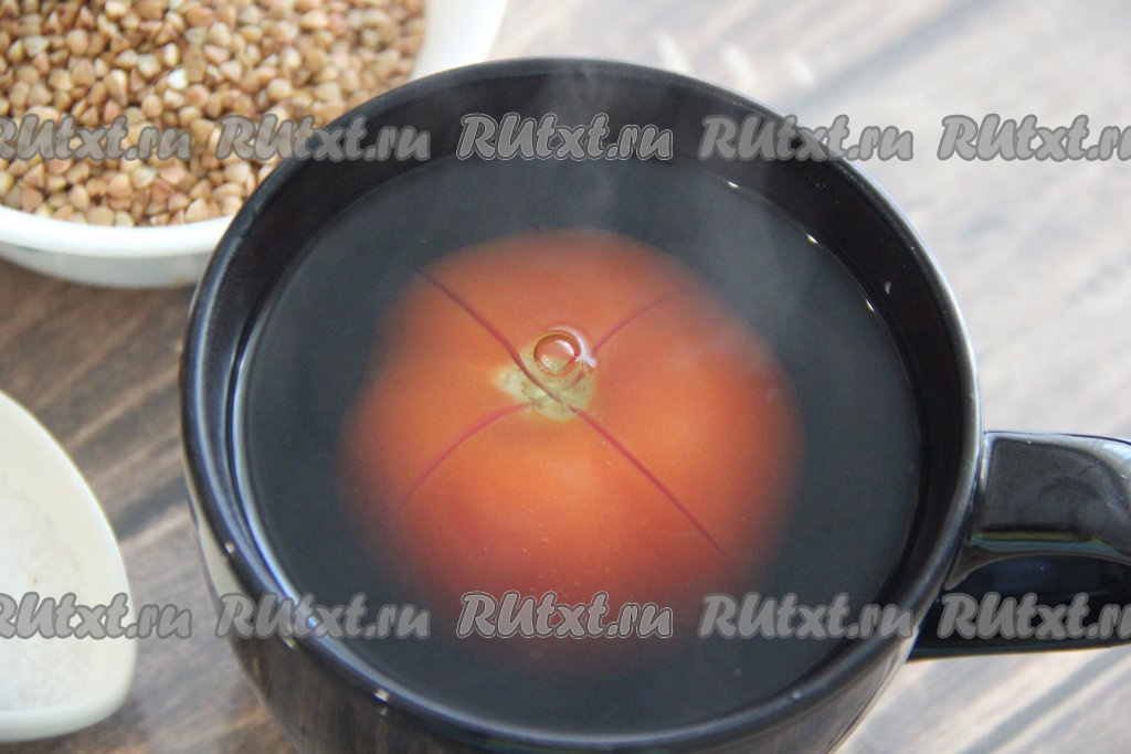 На поверхности помидора сделать крестообразный разрез и поместить его в глубокую миску. Залить помидор крутым кипятком и оставить на 5 минут.
