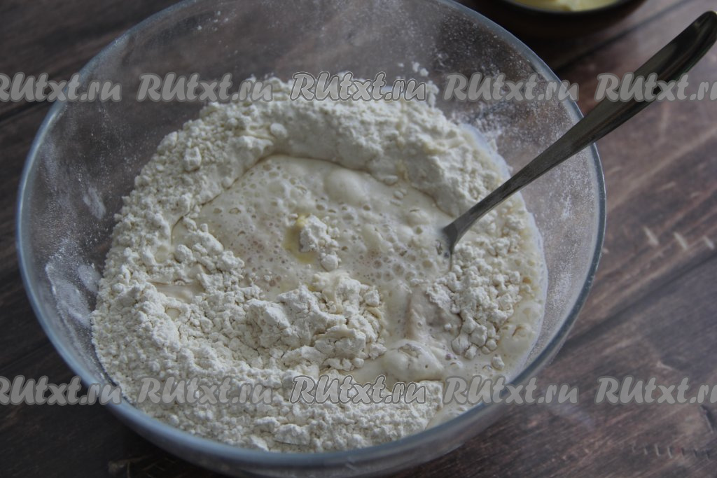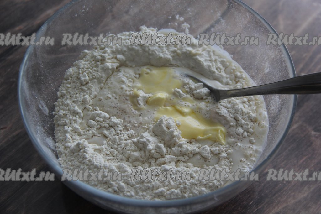 Добавить растопленное чуть тёплое сливочное масло, перемешать тесто вначале ложкой. А затем, когда начнёт формироваться ком, вымесить его руками, замешивая мягкое, нежное, не липнущее тесто.