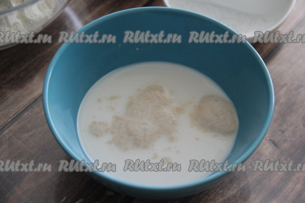 Соединить молоко и воду, слегка подогреть. Температура смеси молока и воды не должна быть выше 40 градусов (если смесь будет более горячей, то дрожжи, которые мы будем в неё добавлять, могут погибнуть). В тёплую смесь воды и молока добавить сухие дрожжи с сахаром, перемешать и оставить опару на 10 минут. Она должна покрыться пузырями - это значит, что дрожжи заработали.