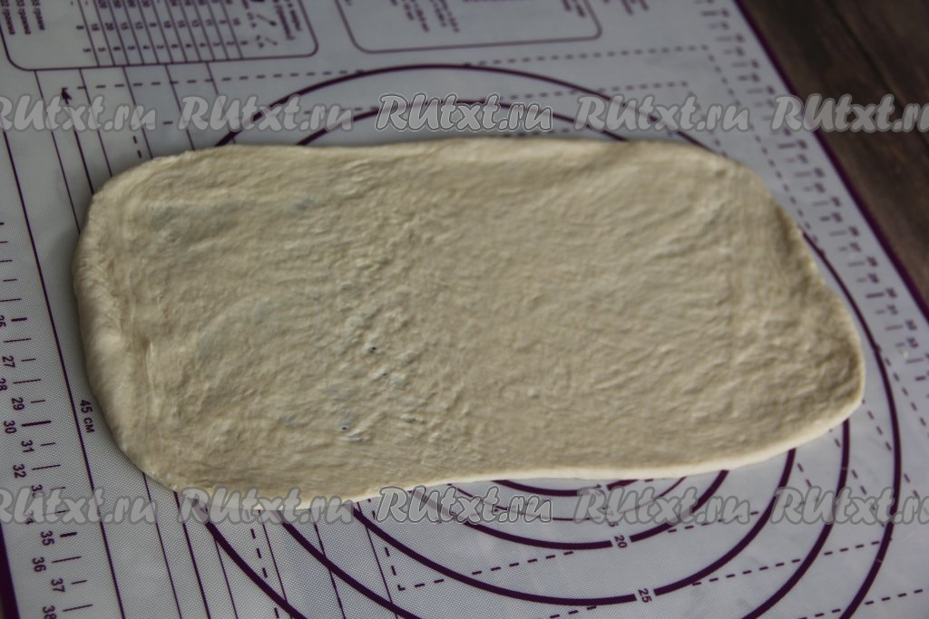 Разделить тесто на две части. Раскатать каждую часть теста на припылённой мукой поверхности в длинный прямоугольник.