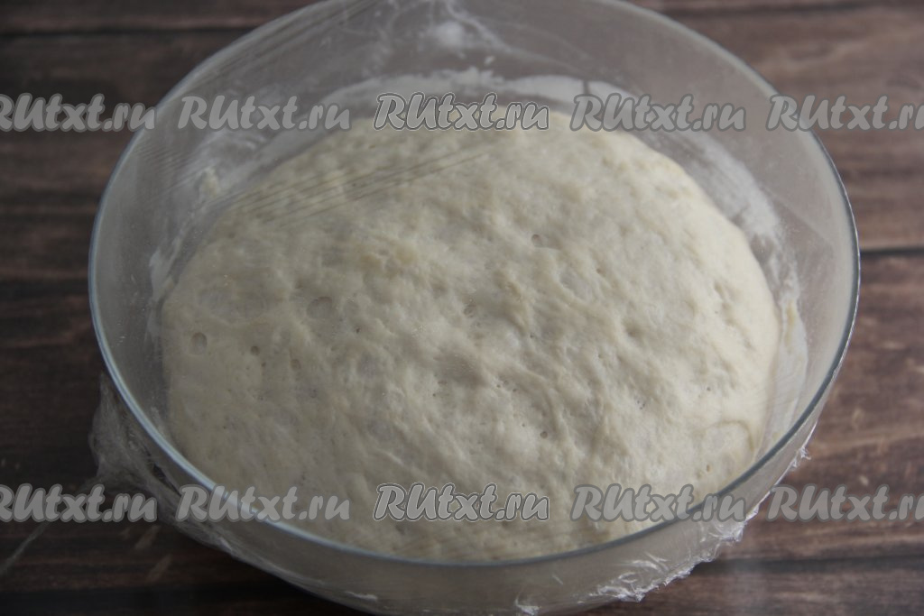Убрать миску с тестом в тёплое место на 1 час, затем обмять тесто и дать ему подняться второй раз (на это потребуется ещё минут 45). Тесто хорошо поднимется, увеличившись в объёме в несколько раз.