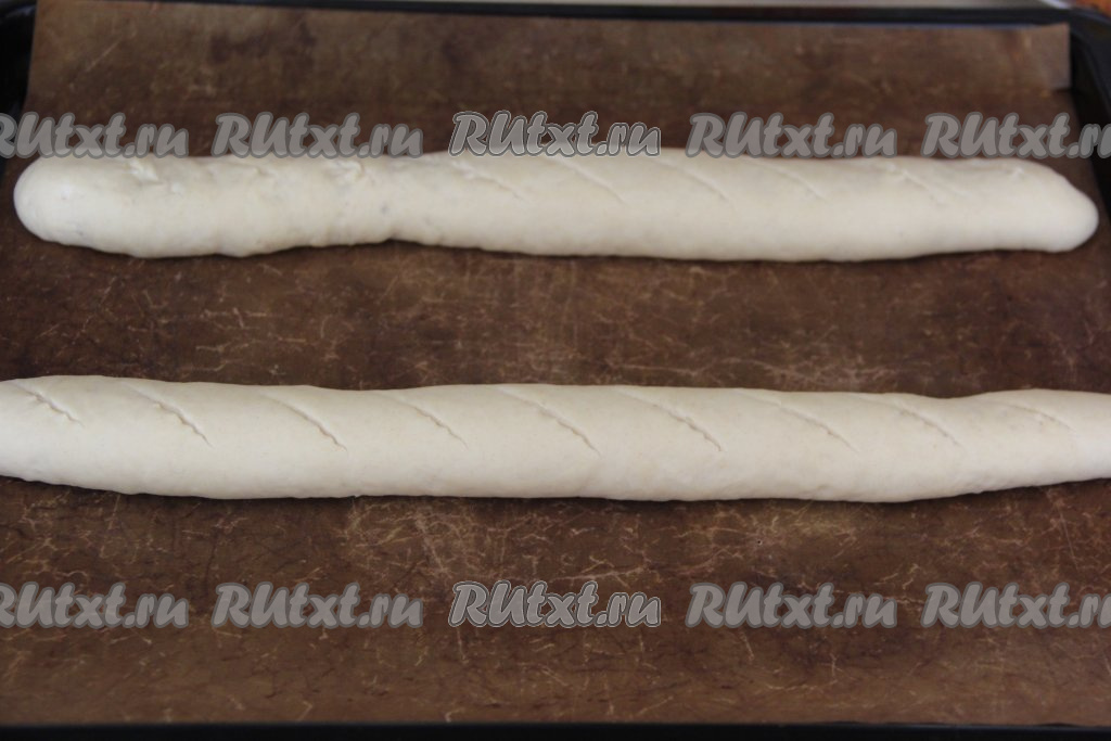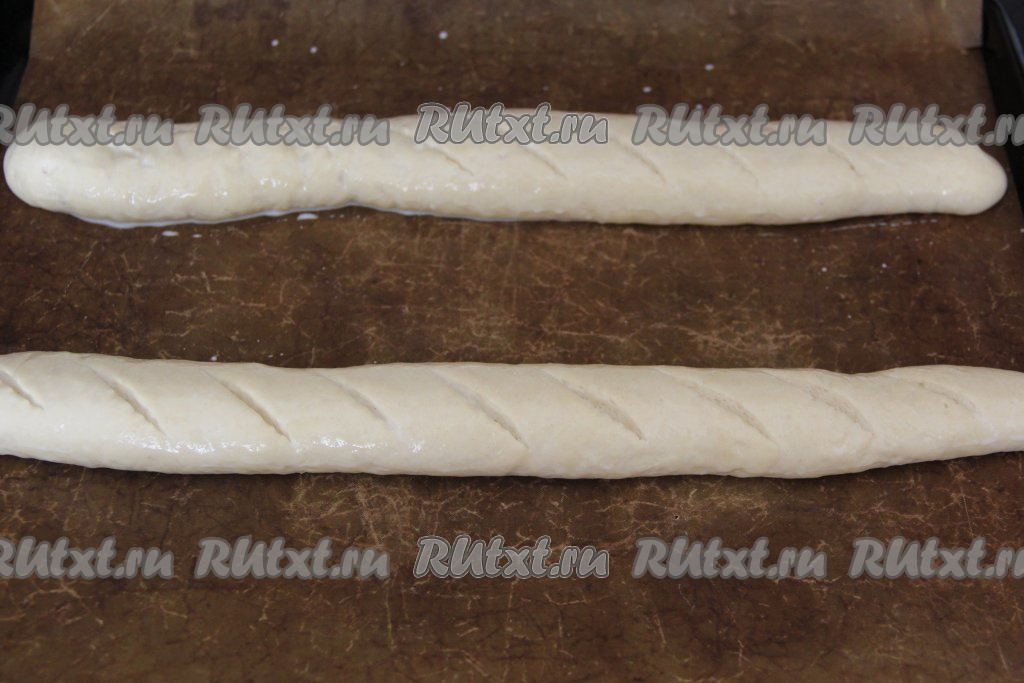 За время расстойки багеты округлятся, затем сделать на них сверху надрезы острым ножом (или лезвием).