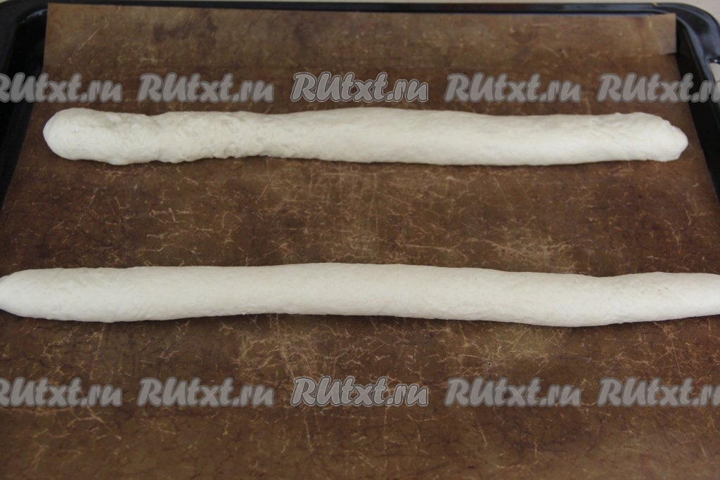Свернуть каждую часть теста в плотный рулет, начиная с длинной стороны (получатся 2 заготовки багетов).