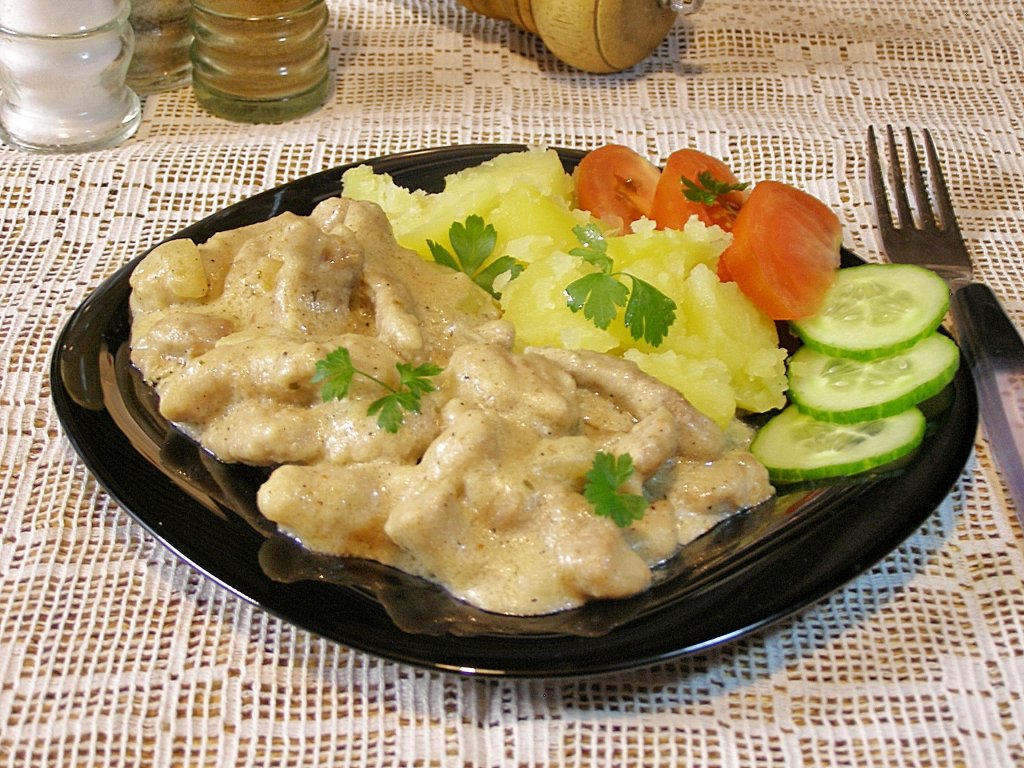Сочный, нежный и аппетитный бефстроганов из свинины подаём к столу с гарниром (например, с отварным картофелем, макаронами или рисом), поливая сметанным соусом, в котором тушилось мясо. По желанию, блюдо можно украсить зеленью и дополнить свежими овощами.