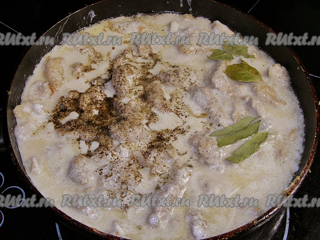 Добавляем лавровый лист, перчим (можно добавить и горошины чёрного перца), солим и снова перемешиваем, доводим сметанный соус до кипения, уменьшаем огонь до минимального и готовим бефстроганов из свинины на сковороде под крышкой минут 25-30 (до мягкости мяса), иногда перемешивая.