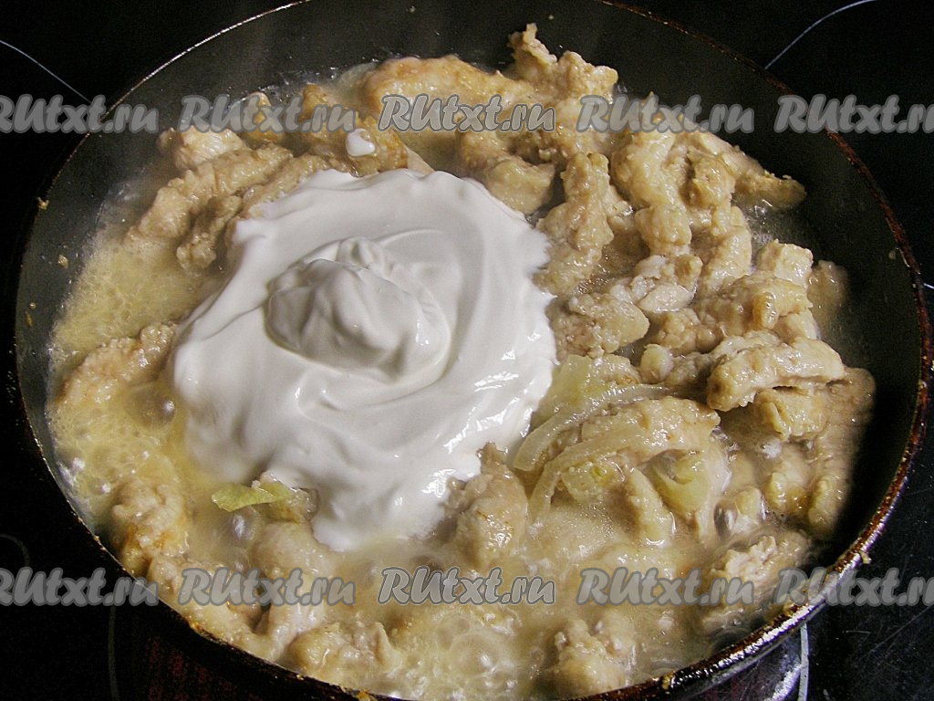 Затем в сковороду к свинине с луком добавляем сметану и горячую кипячёную воду, перемешиваем.
