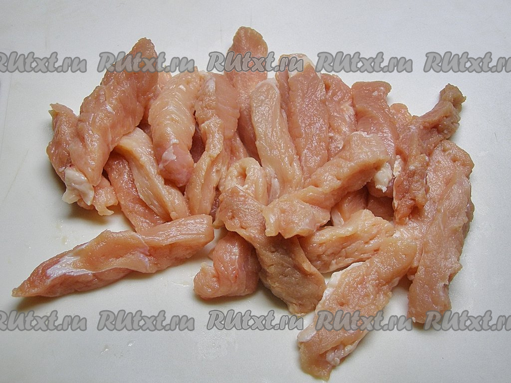 Мякоть свинины ополаскиваем водой, немного обсушиваем, а затем нарезаем на пластины толщиной около 2 сантиметров, слегка отбиваем кулинарным молотком, затем нарезаем на длинные полосочки шириной примерно 1,5-2 сантиметра.