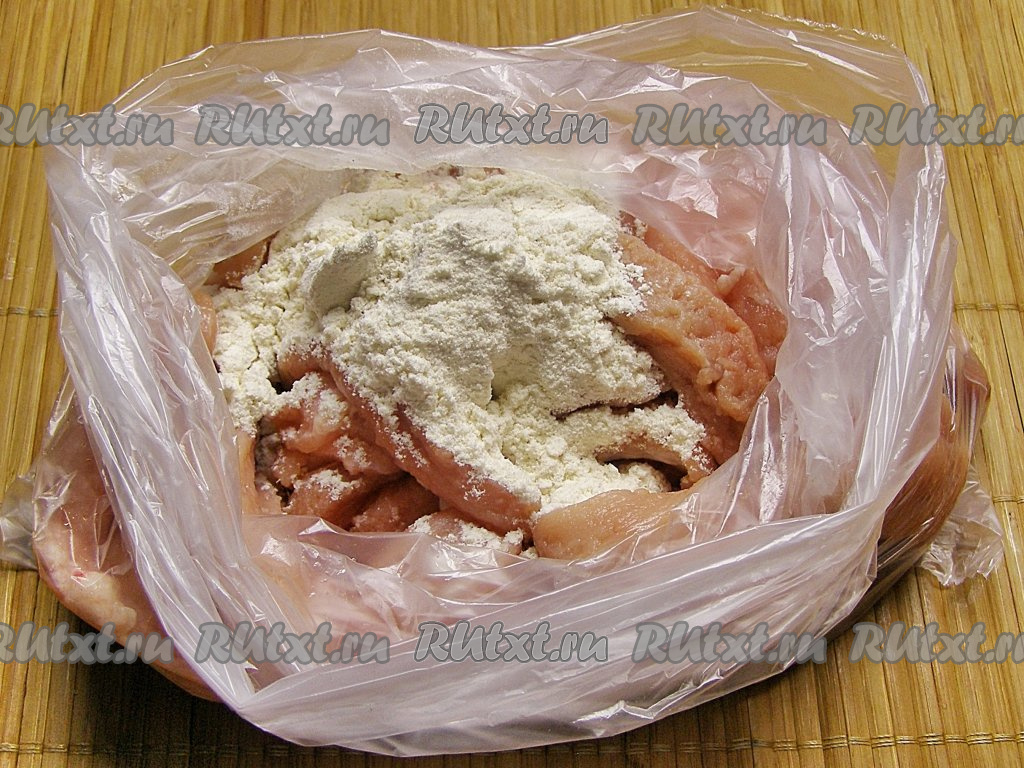 Перекладываем нарезанное мясо в полиэтиленовый пакет и всыпаем туда муку.
