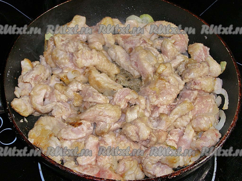 Кладём в сковородку с луком кусочки свинины, обжариваем, помешивая, 5-6 минут (до подрумянивания мяса со всех сторон).